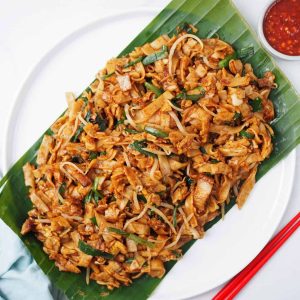 Mie gepeng yang di goreng dengan kecap asin, tauge, udang, dan potongan telur.