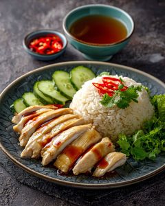 Ayam rebus lembut dengan nasi gurih dan saus jahe pedas.