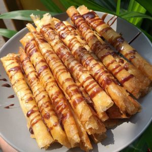 Pisang di balut kulit lumpia, di beri meses atau cokelat batangan, lalu di goreng sampai garing.