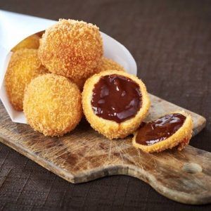 Adonan pisang di campur tepung dan isi cokelat yang meleleh di tengah.
